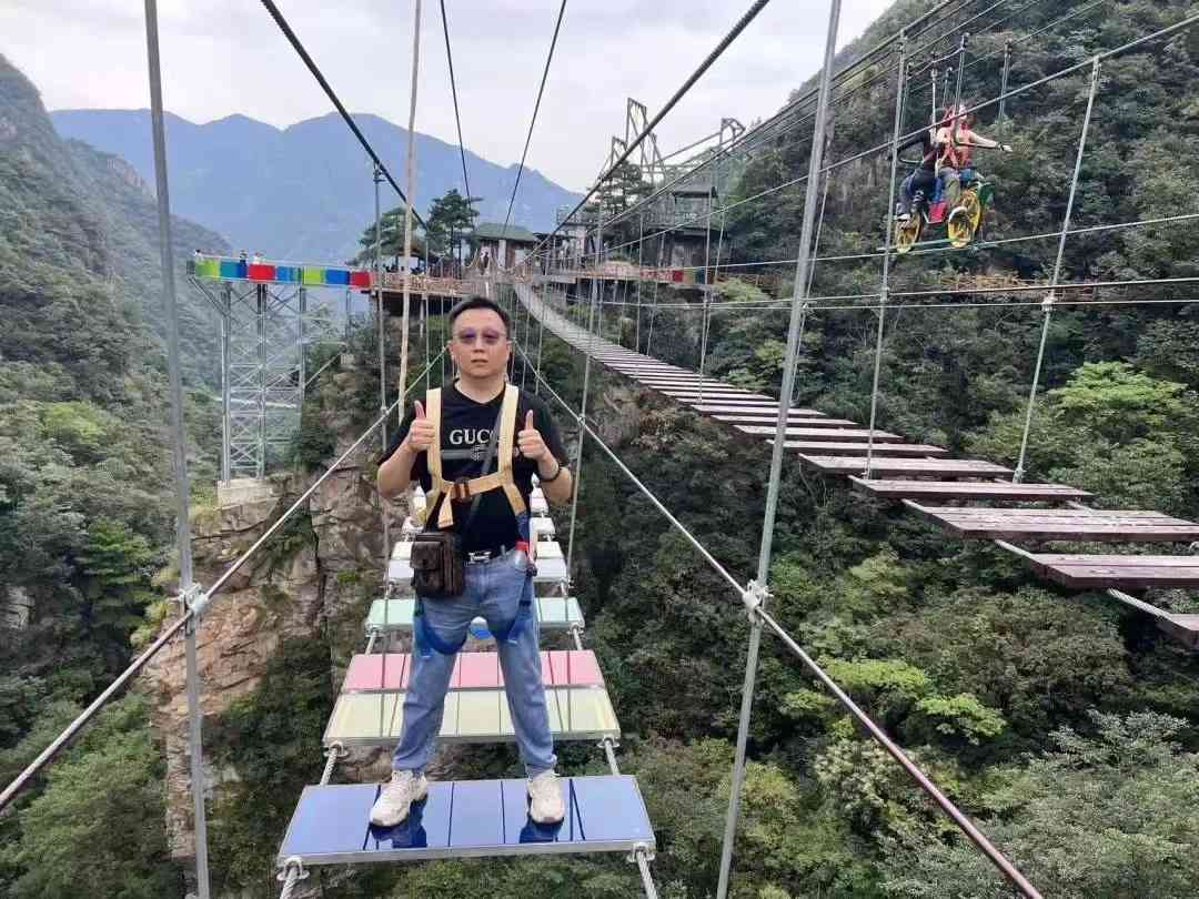 步步惊心网红桥分七彩玻璃桥和原木踏板桥两种,长度约100米。